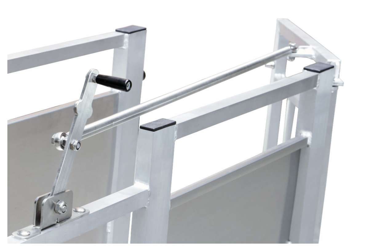 La puerta de entrada se puede operar de forma remota mediante un mecanismo de palanca, de modo que solo se requiere una persona para pesar los cerdos. La báscula tiene ruedas de transporte en la parte delantera. Para el transporte, levantas la balanza por las asas y las empujas por los pasillos como una carretilla.